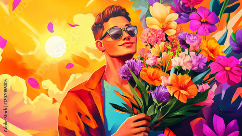 Joyful man holding vibrant bouquet of flowers, wearing sunglasses, against colorful sunset background. scene radiates happiness and celebration