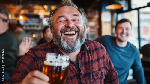 Joyful man laughing with friends in a rustic bar, holding beer glass Room for text Happy social gathering concept