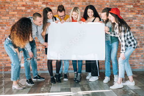 Joyful millennials holding blank whiteboard mockup. Young people laughing, looking at copy space for fun, amusing content.