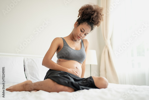 Joyful multiracial pregnant woman looking at her stomach expecting for childbirth. Young beautiful expectant mother relaxing on bed at home. Pregnancy and motherhood feminine anticipation lifestyle.