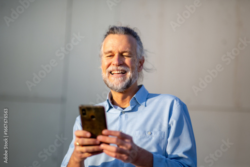 Joyful senior man laughing while using smartphone outdoors