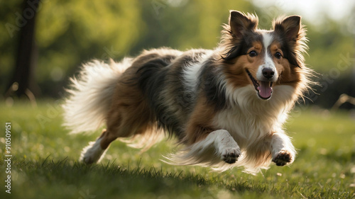 Joyful Shetland Sheepdog Running in Sunlit Field