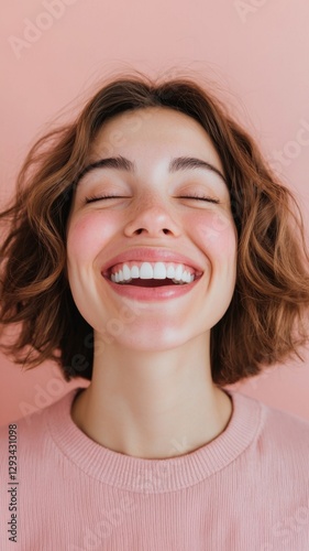 Joyful smiling woman studio setting portrait photo soft background close-up happiness expression