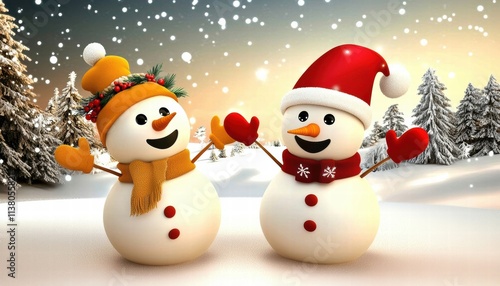 Joyful snowmen celebrate winter in a snowy landscape, bringing cheer and holiday spirit to the festive season.