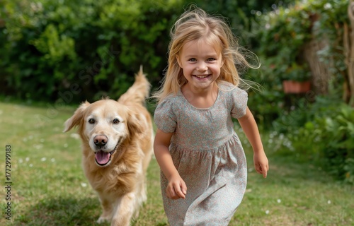 Joyful summer day in the backyard featuring a child and golden retriever enjoying friendship and playfulness