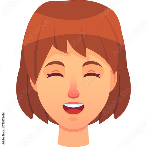Joyful Young Woman With Short Brown Hair Eyes Closed Smiling Widely Open Mouth and Rosy Cheeks Showing Happiness And Delight In A Stylized Flat Cartoon Illustration Isolated On White