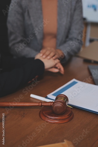 Judge gavel with Justice lawyers having team meeting at law firm background. Concepts of Law and Legal services.