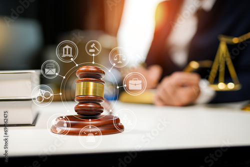 judge on wooden table And experienced lawyers meet with clients and give advice behind the scenes. legal services legal consulting concept