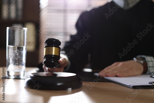 Judge striking gavel at table indoors, selective focus