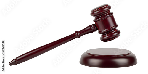Judge's gavel hammer for adjudication, wooden auction hammer with a wooden stand isolated on white or transparent background.