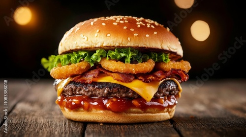 Juicy cheeseburger with crispy onion rings and fresh lettuce