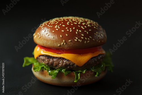 Juicy cheeseburger with grilled beef patty, melted cheddar cheese, fresh lettuce, and tomato slices in a glossy sesame seed bun on dark background.