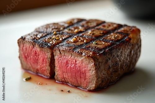 Juicy Grilled Steak Sliced Open with Pink Interior Against Minimalist White Background