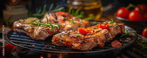 Juicy grilled steak with fresh herbs and ripe tomatoes, perfect for a delicious meal or culinary themed project.
