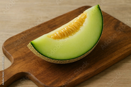 Juicy Honeydew Melon Slice on Rustic Wooden Board: Close-up Photography