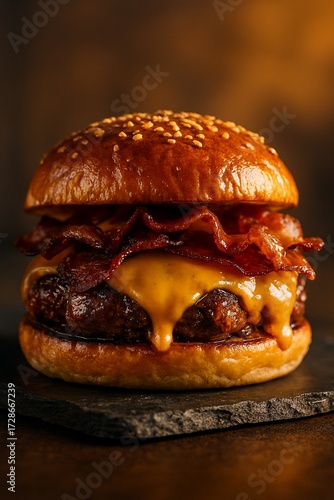 Juicy, indulgent burger captured in warm golden light—perfect for food delivery apps and casual dining ads.