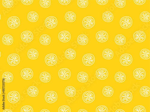 Juicy lemon slices seamless pattern. White elements on bright yellow background. Vector illustration in doodle style