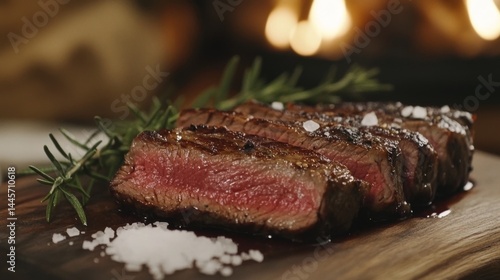Juicy medium rare ribeye steak sliced