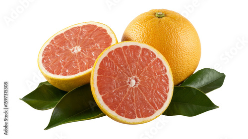 Juicy Pink Grapefruit Halves with Whole Grapefruit and Green Leaves