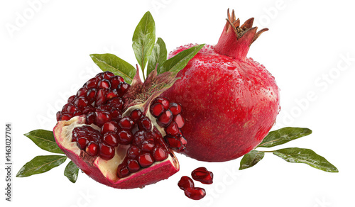 Juicy red pomegranate fruit with seeds and green leaves isolated on wet on transparent background