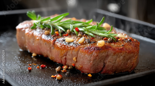 Juicy steak searing on hot grill pan, garnished with fresh rosemary, garlic, and peppercorns, savory and appetizing meal