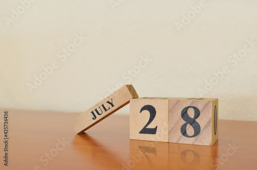 July 28, Date design with calendar cube on wooden table and white background.