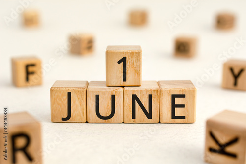 June 1 - from wooden blocks with letters, important date concept, white background random letters around