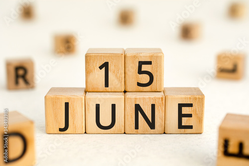 June 15- from wooden blocks with letters, important date concept, white background random letters around