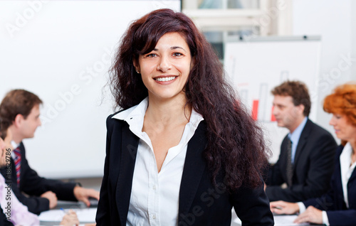 Junge erfolgreiche geschäftsfrau lachend mit konferenz