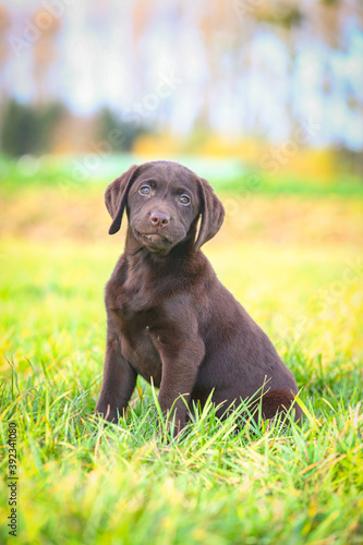 Junger brauner Labrador Welpe auf einer Wiese