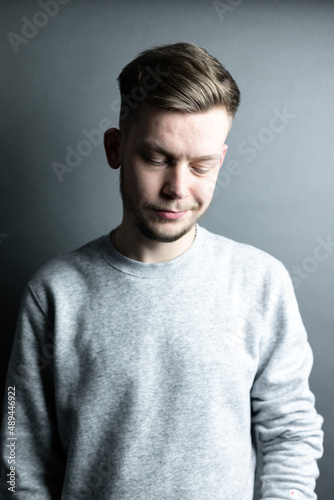 Junger Mann Portrait vor grauem Hintergrund nach unten schauend