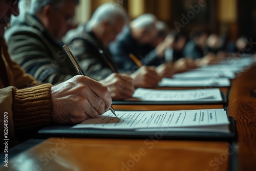 Jurors Signing Legal Documents During Courtroom Proceedings in Close-Up View