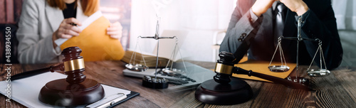 Justice and law concept.Male judge in a courtroom with the gavel, working with, computer and docking keyboard, eyeglasses, on table in morning light