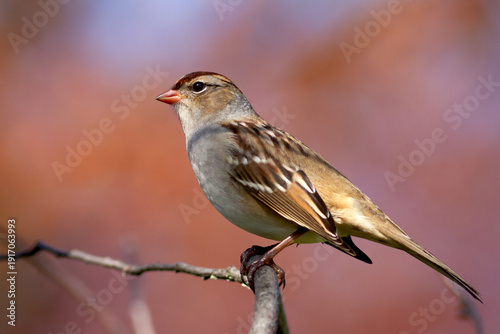 Juvenile white-crowned sparrow on a branch with a natural autumn background