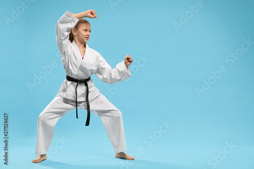 Karate junior in defense position, training.