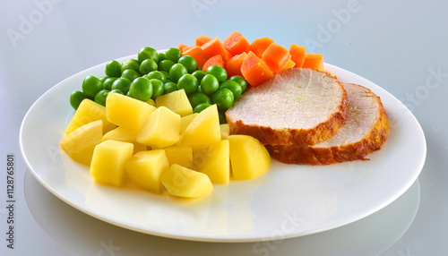 Kasseler mit Kartoffeln Erbsen und Karotten, Tellergericht, Gemüse,