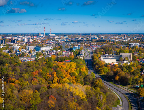 Kaunas landscape, Lithuania. Panoramic view of city center in autumn. Aerial drone view photo
