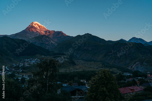 Kazbek Mountain in the rays of the dawn sun. The snowy peak of the mountain is flooded with orange light from the sun. Silhouette of mountains against the blue sky. The village at the foot of the peak