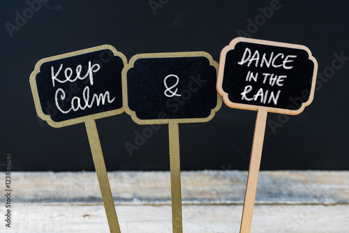 Keep Calm and Dance In The Rain message written with chalk on mini blackboard labels
