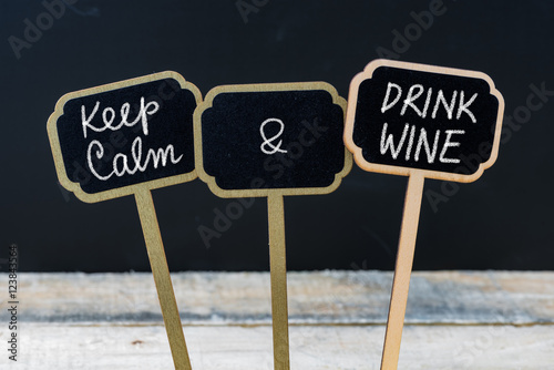 Keep Calm and Drink Wine message written with chalk on mini blackboard labels