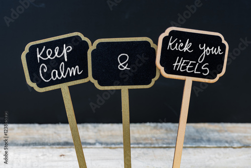 Keep Calm and Kick Your Heels message written with chalk on mini blackboard labels