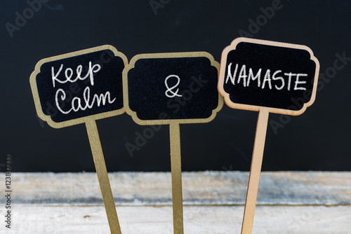 Keep Calm and Namaste message written with chalk on mini blackboard labels