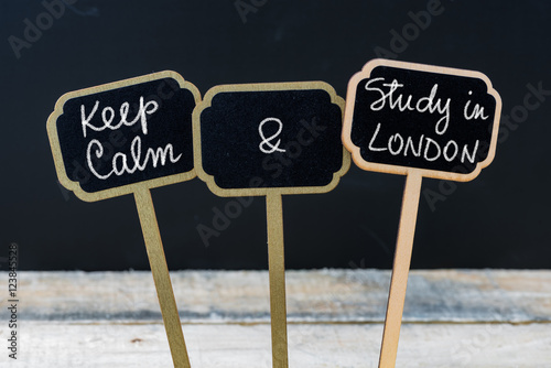 Keep Calm and Study In London message written with chalk on mini blackboard labels