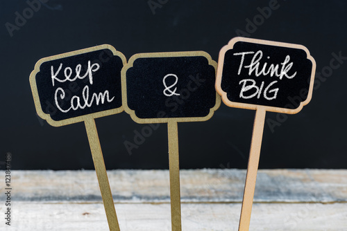 Keep Calm and Think Big message written with chalk on mini blackboard labels