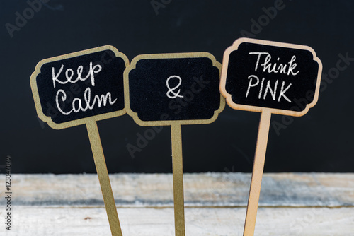 Keep Calm and Think Pink message written with chalk on mini blackboard labels