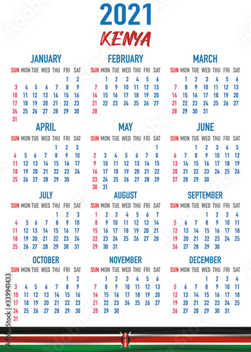 Kenya Calendar with flag. Month, day, week. Simply flat design. Vector illustration background for desktop, business, reminder, planner