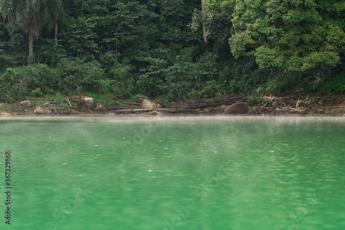 Kenyir lake water with tropical forest trees. Beautiful tranquill idylic view.