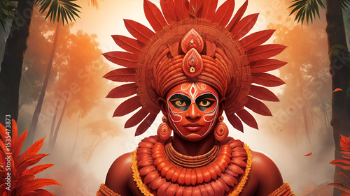 Kerala Theyyam Performer with Ornate Headgear in Forest Background