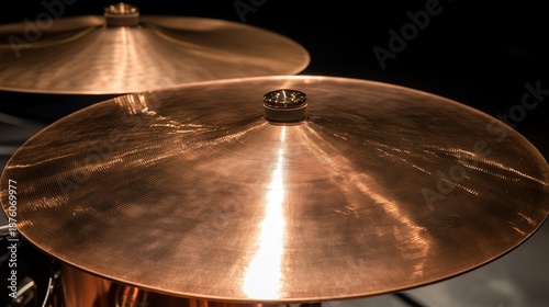 kettledrums. A pair of polished copper kettledrums with taut drumheads gleaming under focused stage lighting. product launch decks.