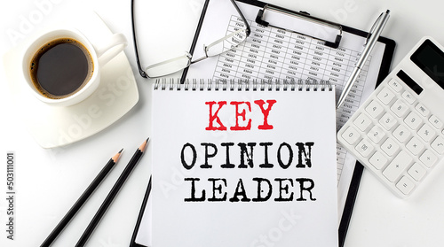 KEY OPINION LEADER text on the paper with calculator, notepad, coffee ,pen with graph